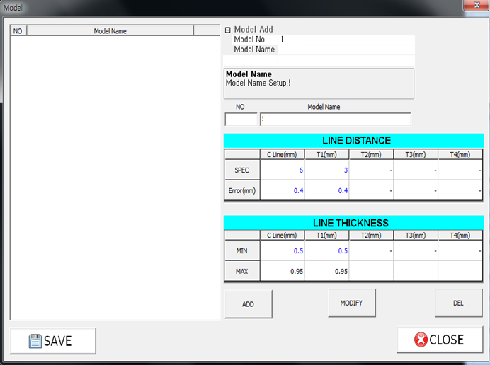 각 Model 별로 시약의 Line간 간격, Thickness 및 오차 범위를 설정 하여 Model로 관리